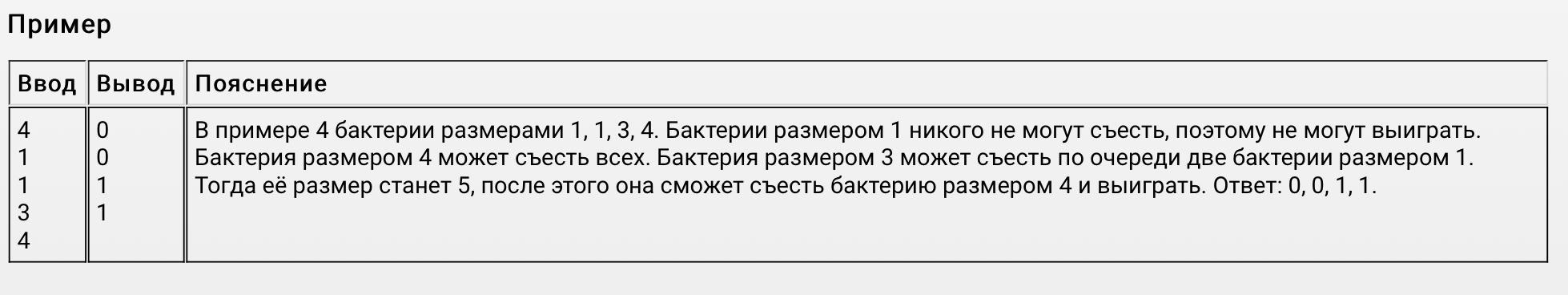 Программа должна вывести N чисел равных «0» или «1», по одному числу в строке. Если i-е число равно 0, то это означает, что i-й игрок (размер бактерии которого первоначально был равен ai) ни при каких обстоятельствах не может выиграть в этой игре. Если i-е число равно 1, то это означает, что i-й игрок имеет возможность выиграть в этой игре.