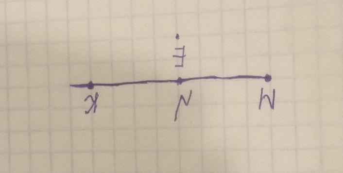 На прямой отметьте последовательно три точки М, N и K, и точку Е не принадлежащую данной прямой.