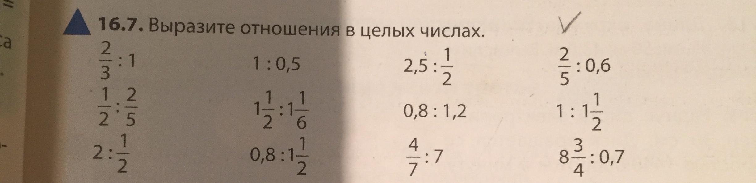 2/3÷1=2/3. 1÷0,5=2. 0,8÷1,2=2/3. 2/5÷0,6=2/3. 1/2÷2/5=5/4. 1 1/2 ÷1 1/6=1/4. 0,8÷1,2=2/3. 1÷1 1/2=1/2. 2÷1/2= 4. 0,8÷1 1/2=2/5. 4/7÷7=4/49. 8 3/4 ÷0,7=25/2
