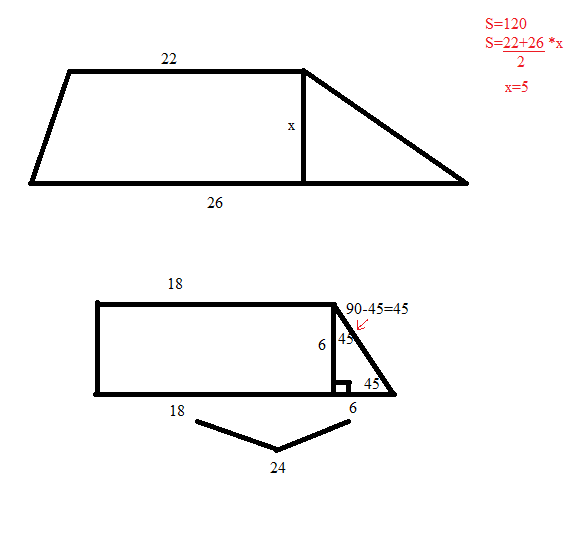2)найдите площадь прямоугольной трапеции,если её основания равны 18 см и 24 см,а один из углов 45 градусов.