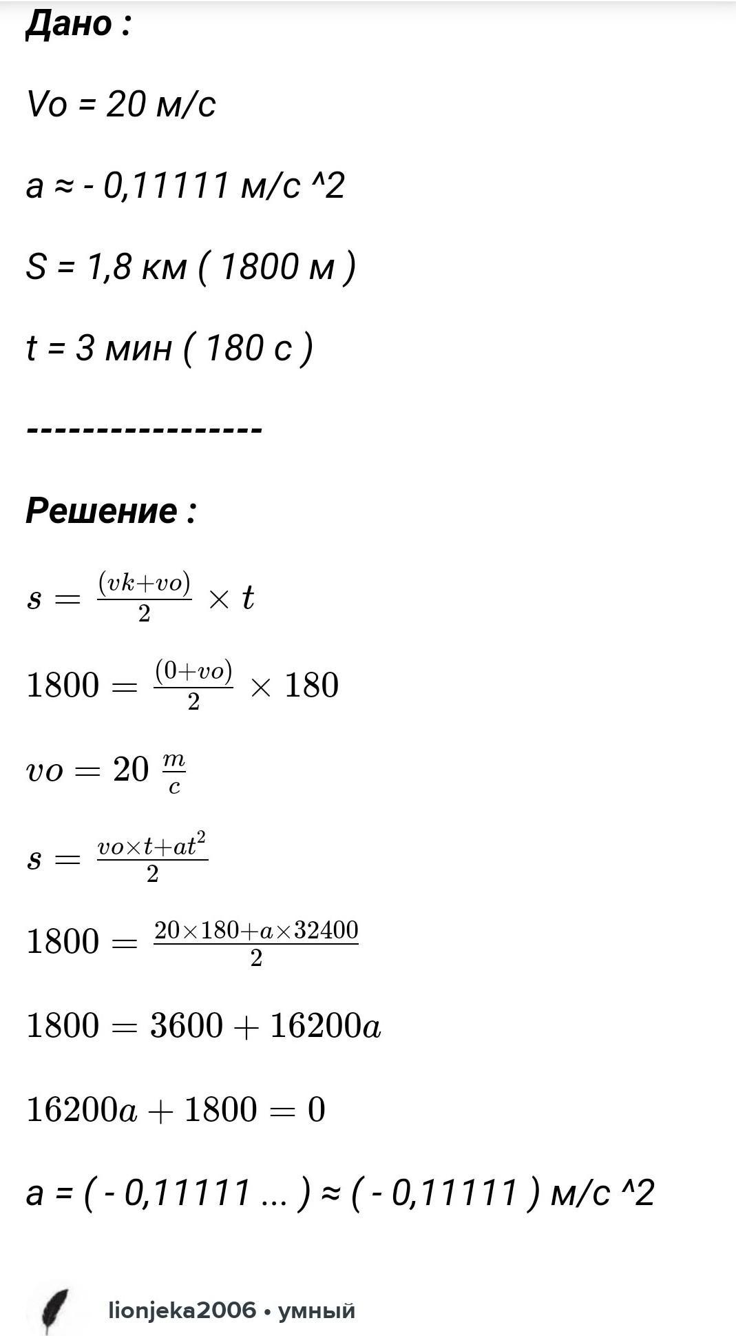 поезд подходя к станции начал торможение и спустя 3 минуты остановился. какова начальная скороть поезда если он от начала торможения прошел до остановки 1,8 км? с каким ускорением происходило торможение?