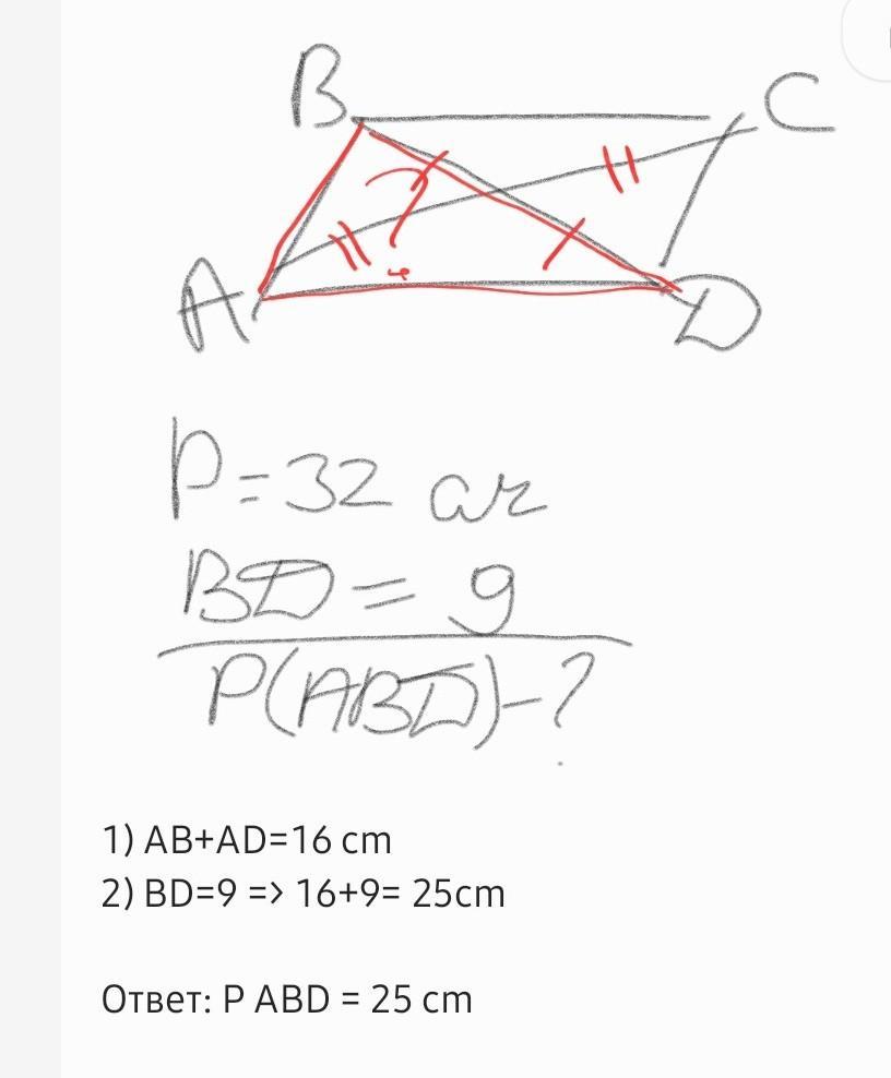 Периметр параллелограмма АВCD равен 32см, а длина диагонали ВD равна 9 см. Найдите пеример треугольник АВD.