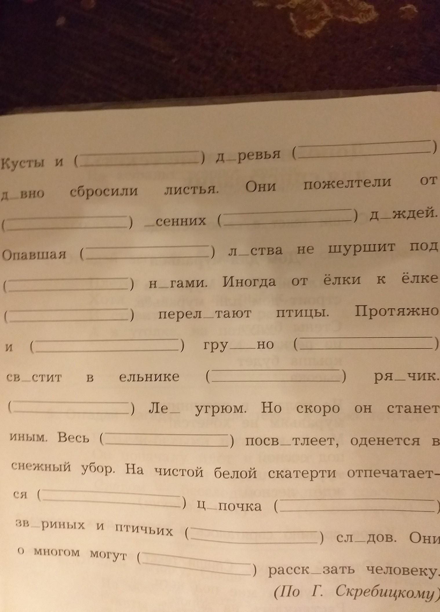 Кусты и деревья давно сбросили листья. Они пожелтели от осенних дождей. Опавшая листва не шуршит под ногами. Иногда от ёлки к ёлке перелетают птицы. Протяжно и грустно свистит в ельнике рябчик. Лес угрюм. Но скоро он станет иным. Весь посветлеет, оденется в снежный убор. На чистой белой скатерти отпечатается цепочка звериных и птичьих следов. Они о многом могут рассказать человеку.