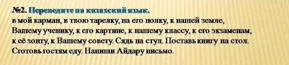 Менің қалтам,сенің табағыңда,оның сөресінде,бздің жер, сіздің оқушыларыңыз, оның суретінде, біздің сыныпта, оның емтиханы, сіздің кеңесіңіз, орыныңа отыр, оның қолшатыры, кітапті үстелге қой, қонаққа барамыз оған, Айнұрға хат жазыңыз