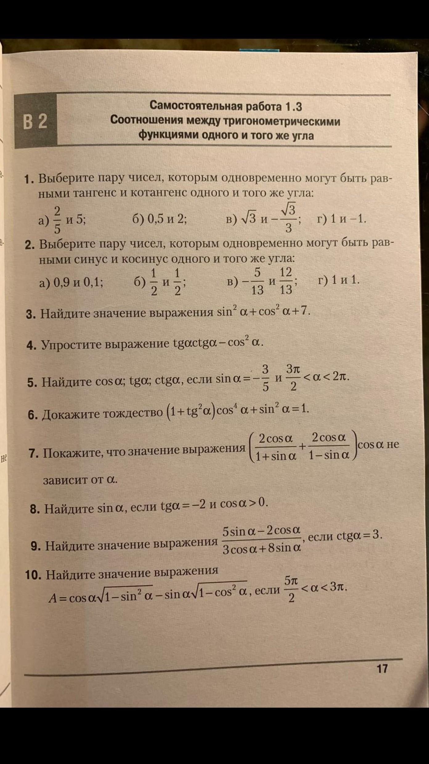 Соотношения между тригонометрическими функциями одного и того же угла. Вариант 2