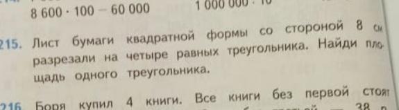 Так, як квадрат поділили на 4 рівні трикутники, то площа трикутника є в чотири рази меншою, ніж площа квадрата, тоді: