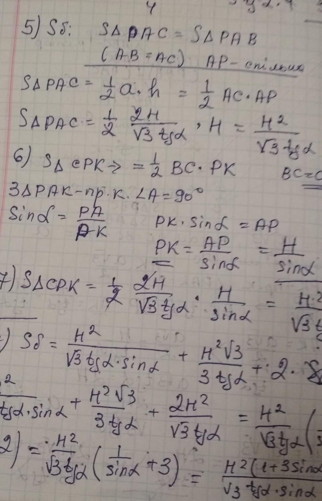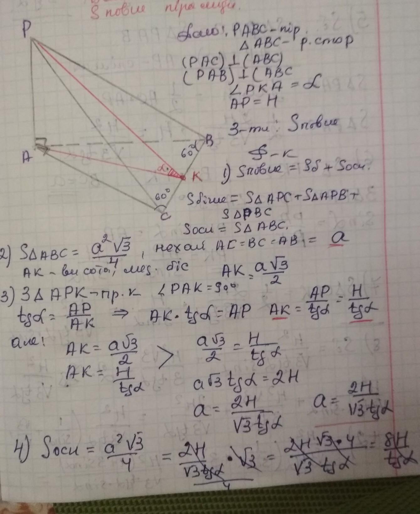 Основа піраміди — правильний трикутник. Дні бічні грані піраміди перпендикулярні до площини основи, а третя — нахилена до неї під кутом α. Висоти піраміди дорівнює Н. Знайдіть повну поверхню піраміди.