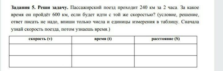 Задание 5. Реши задачу. Пассажирский поезд проходит время он пройдёт 600 км, если будет идти с той же скоростью? (условие, решение, ответ писать не надо, впиши только числа и единицы измерения в таблицу. Сначала узнай скорость поезда, потом узнаешь время.) скорость (v) время (t) расстояние (S)