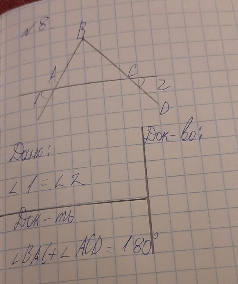 <1=<ВАС, вертикальные углы. <АСД и <2 смежные углы их сумма равна 180°. Т.е. <АСД+<2=180°. <2=<1 по условию, отсюда следует что <2=<ВАС. <ВАС+<АСД=180°