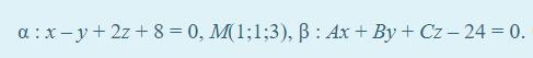 Плоскость α задана уравнением. Найдите неизвестные коэффициенты уравнения плоскости β, если известно, что она проходит через точку М параллельно плоскости α.