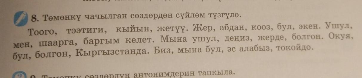 Тээтиги тоого кыйын жетуу. Бул жер абдан кооз экен. Ушул шаарга мен баргым келет. Ушул дениз мына жерде болгон. Бул окуя Кыргызстанда болгон. Биз мына бул токойдо эс алабыз.