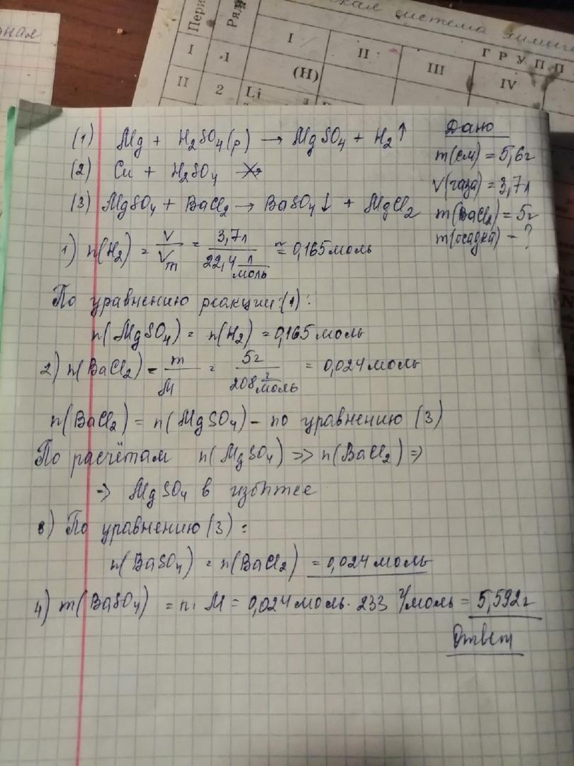 4. При обработке смеси магния и меди массой 5,6 г разбавленной серной кислотой выделился газ, объемом 3,7 л. Полученную соль обработали раствором хлорида бария с массой соли 5 г. Найти массу осадка, полученного в конечной реакции.
