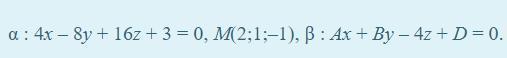 Плоскость α задана уравнением. Найдите неизвестные коэффициенты уравнения плоскости β, если известно, что она проходит через точку М параллельно плоскости α