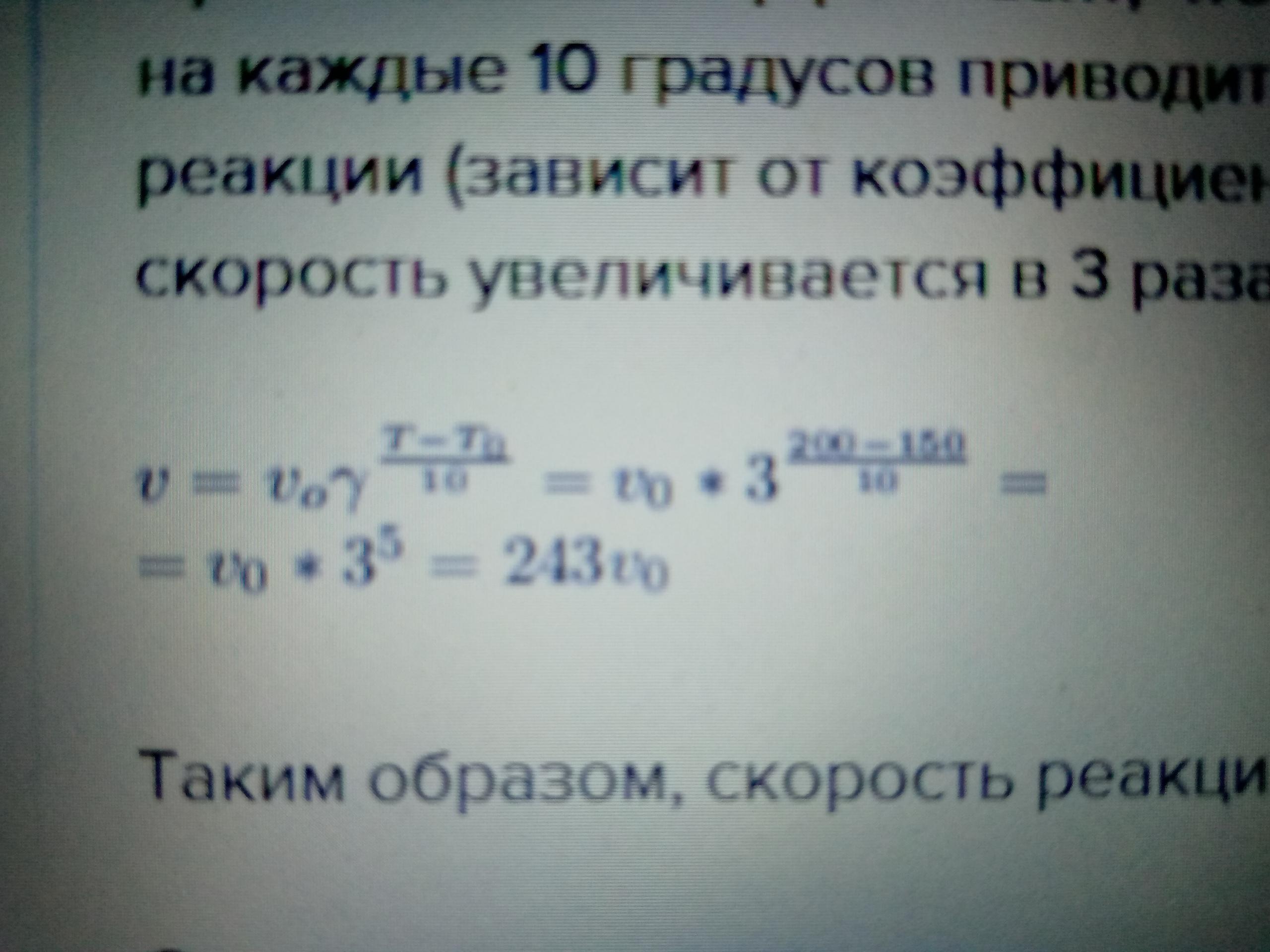 3.Правило Вант-Гоффа гласит, что увеличение (уменьшение) температуры на каждые 10 градусов приводит к увеличению (уменьшению) скорости реакции (зависит от коэффициента). Поскольку на каждые 10 градусов скорость увеличивается в 3 раза, математически это можно записать