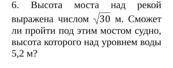 √30≈5,47 м. Судно высотой над водой 5,2 м пройдет и останется зазор 5,47-5,2=0,27 м=27 см.