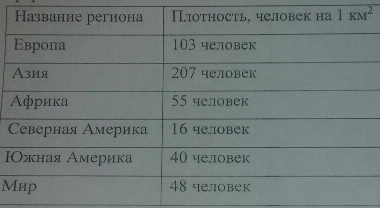Изучив таблицу о средней плотности населения можно сказать, что оно расположено на земном шаре неравномерно, больше всего населения проживает в восточном и северном полушариях.Большая плотность населения приходится на хорошо освоенные территории с равнинным рельефом и мягким климатом.Самая низкая плотность в Северной Америке, а самая высокая в Азии.