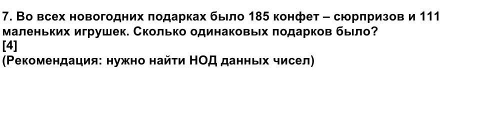7. Во всех новогодних подарках было 185 конфет – сюрпризов и 111 маленьких игрушек. Сколько одинаковых подарков было? [4]