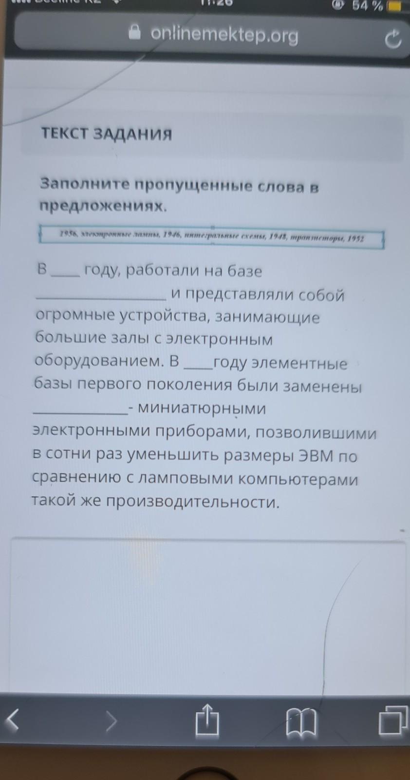 слова которые нужно вставить: 1956,электронные лампы,1946,интегральные схемы,1948,транзисторы,1956