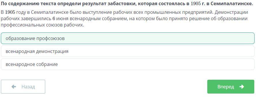 По содержанию текста определи результат забастовки, которая состоялась в 1905 г. в Семипалатинске.