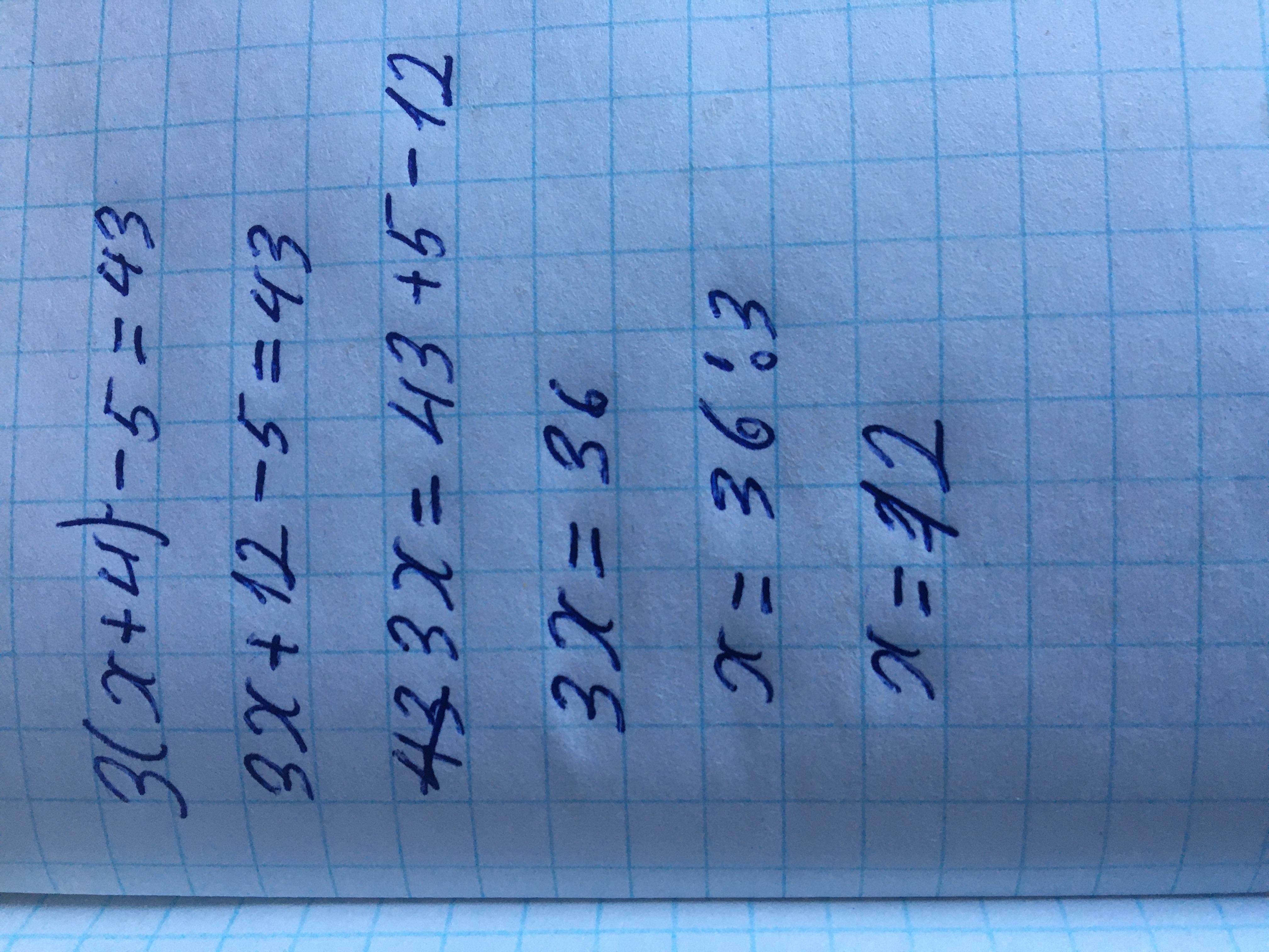 3(x+4)-5=43 решите пожалуйста даю 40 баллов только как мы в тетради пишим так ответ и запишите полностью всё пишите ок? я на вас надеюсь