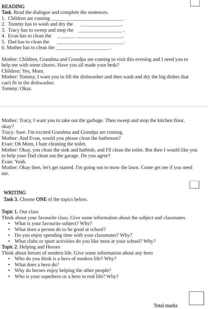 Mother: Children, Grandma and Grandpa are coming to visit this evening and I need you to help me with some chores. Have you all made your beds?