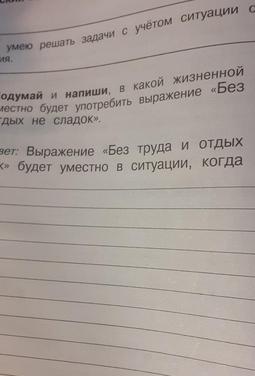 Подумай и напиши в какой жизненой ситуации уместно будет употребить выражение без труда и отдых не сладок ответ выражение без труда и отдых не сладок будет уместно в ситуации когда