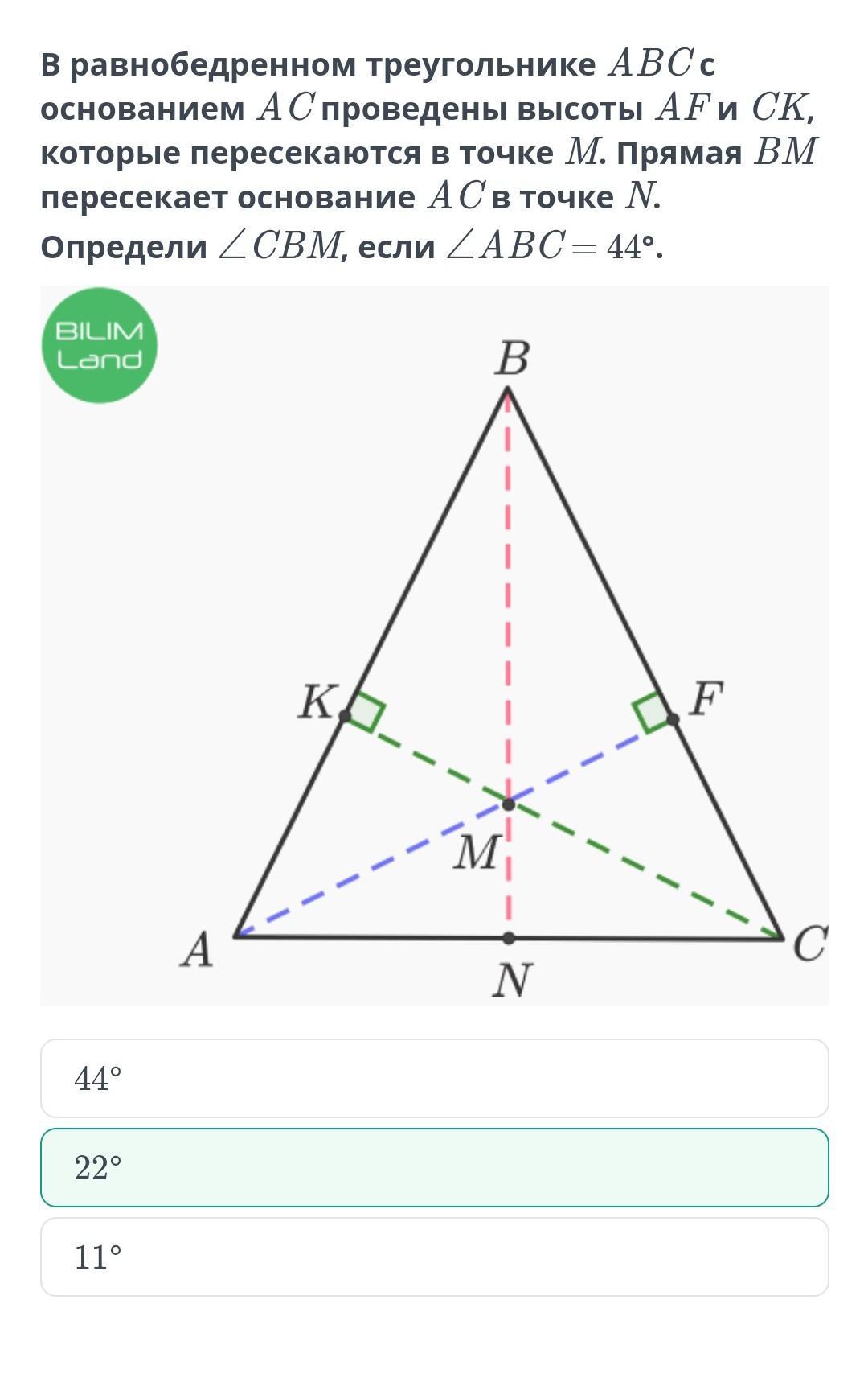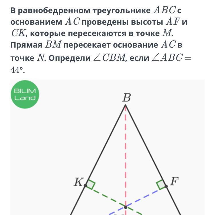 равнобедренном треугольнике ABC с основанием AC проведены высоты AF и CK, которые пересекаются в точке M. Прямая BM пересекает основание AC в точке N. Определи ∠CBM, если ∠ABC = 44°.