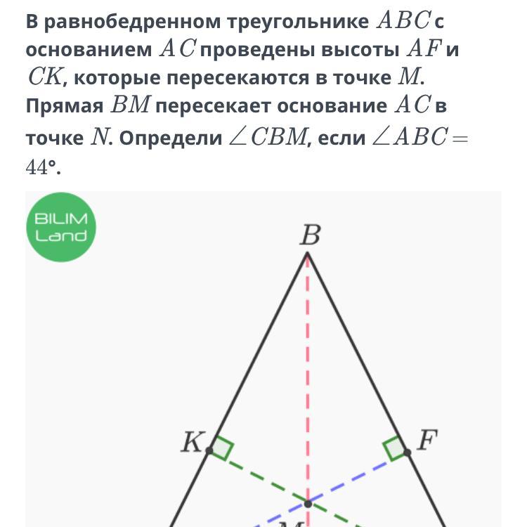 равнобедренном треугольнике ABC с основанием AC проведены высоты AF и CK, которые пересекаются в точке M. Прямая BM пересекает основание AC в точке N. Определи ∠CBM, если ∠ABC = 44°.