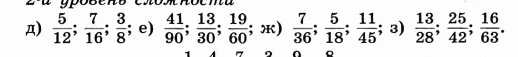 12=3*2*2. 16=2*2*2*2. 8=2*2*2. НОК=3*2*2*2*2=48. Общий знаменатель 48. 5/12=5*4/12*4=20/48; 7/16=3*7/3*16=21/48; 3/8=3*6/8*6=18/48