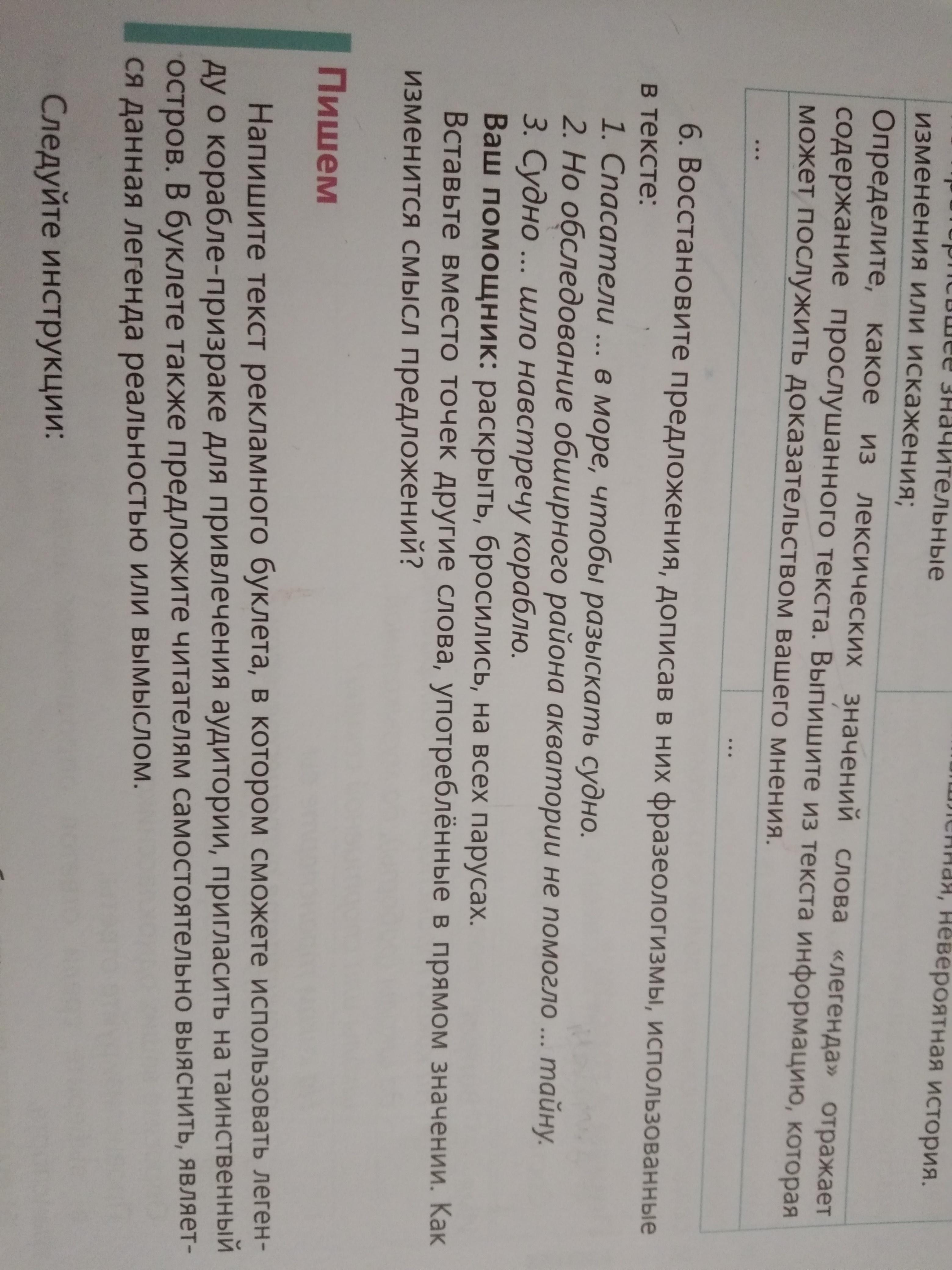 6. Восстановите предложения, дописав в них фразеологизмы, использованные в тексте 1. Спасатели ... в море, чтобы разыскать судно. 2. Но обследование обширного района акватории не помогло ... тайну. 3. Судно ... шло навстречу кораблю. Ваш помощник: раскрыть, бросились, на всех парусах. Вставьте вместо точек другие слова, употреблённые в прямом значении. Как изменится смысл предложений? Срочнооооо