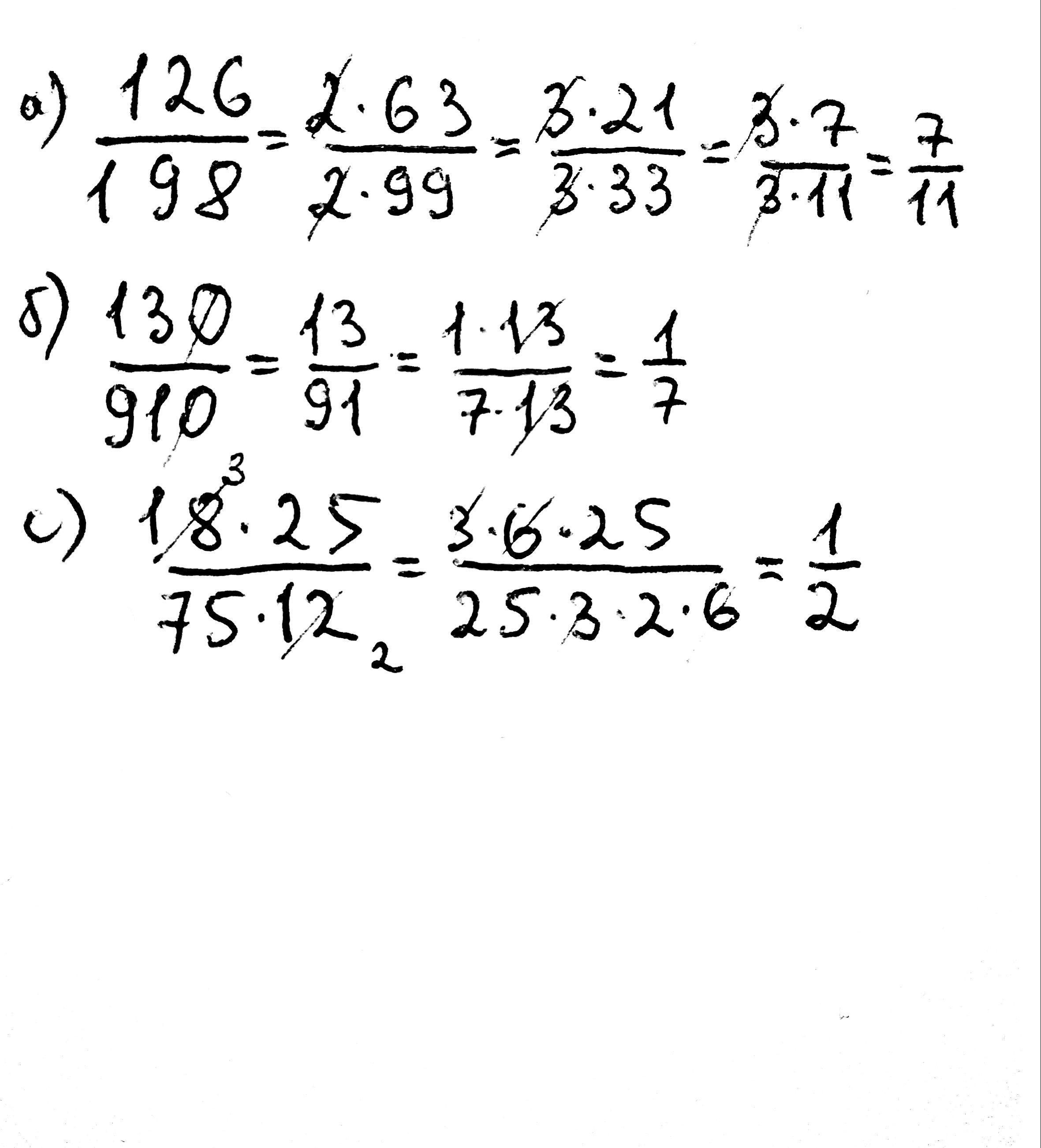 Срочно!!! даю 40 баллов Запишите в виде несократимой дроби: а)126/198 б)130/910 с)18*25/75*12
