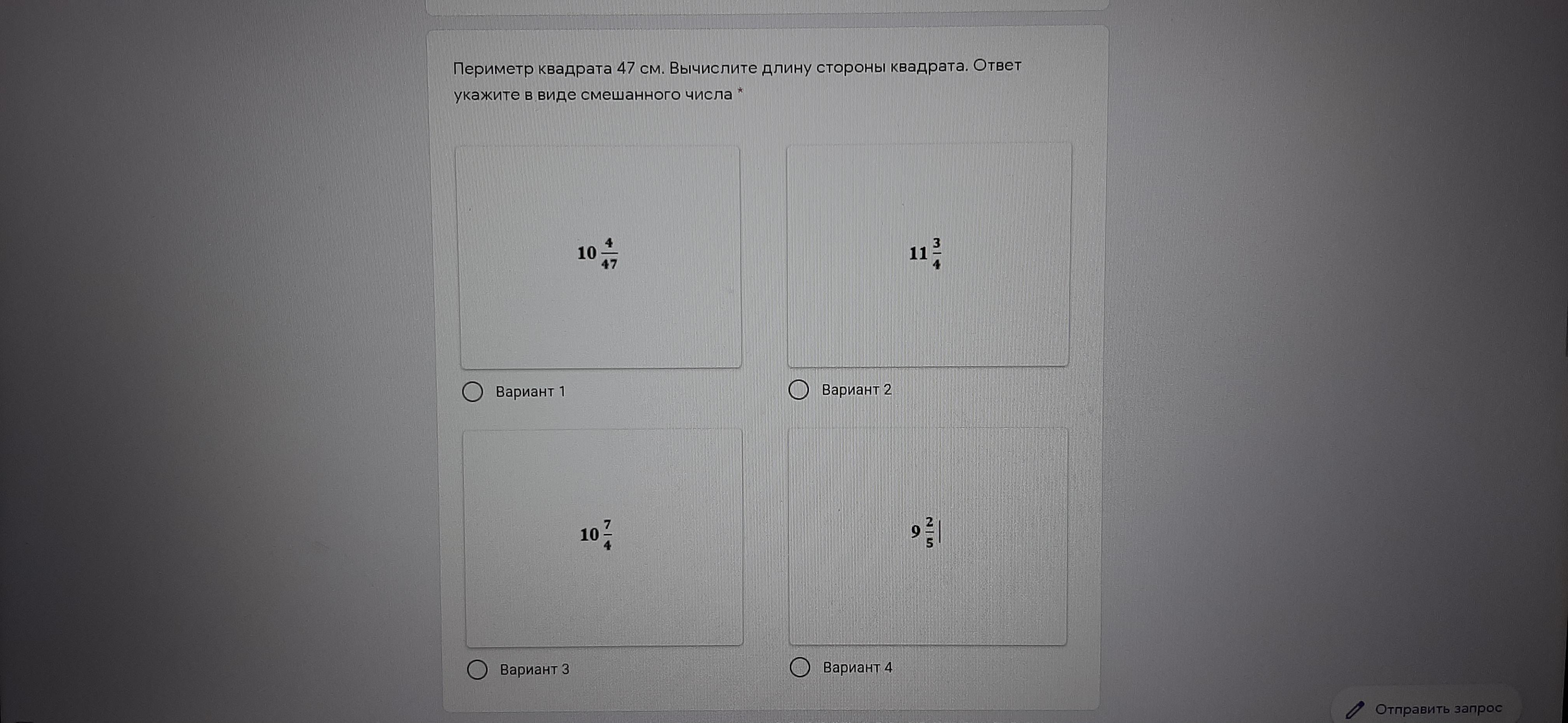 Периметр квадрата 47 см. Вычислите длину стороны квадрата. Ответ укажите в виде смешанного числа.