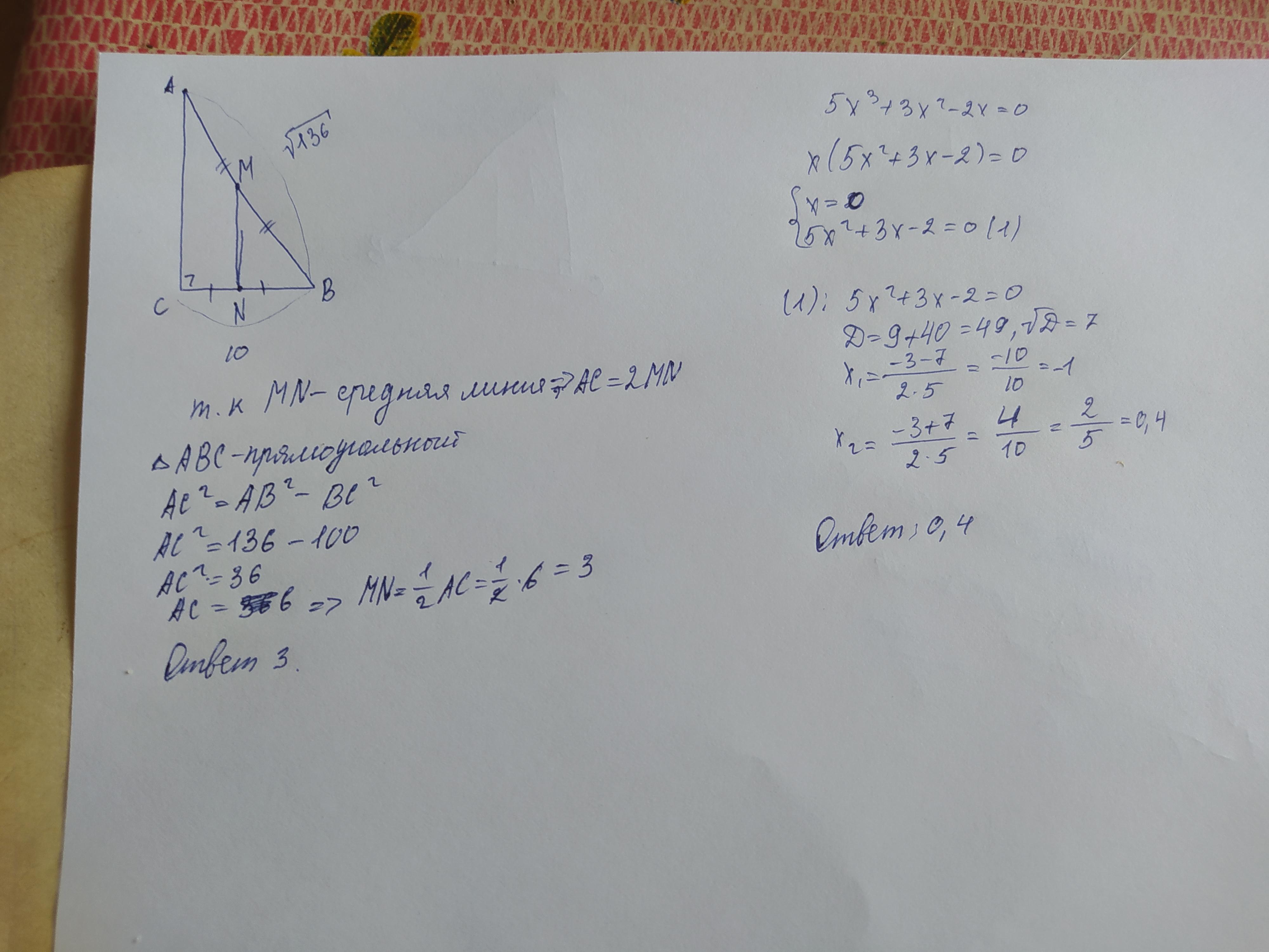 10.В прямоугольном треугольнике АВС с прямым углом С проведена средняя линия МN параллельная катету АС найдите длину МN если АВ=√136 ВС=10