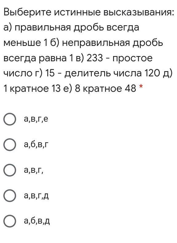 Выберите истинные высказывания: а) правильная дробь всегда меньше 1 б) неправильная дробь всегда равна 1 в) 233 - простое число г) 15 - делитель числа 120 д) 1 кратное 13 е) 8 кратное 48 *