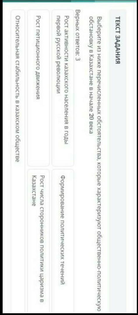 выбери из ниже перечисленных обстоятельства, которые характеризуют общественно-политическую обстановку в Казахстане в начала 20 века