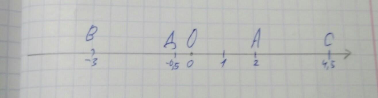 5. Начертите координатную прямую с единичным отрезком 2 клетки тетради и отметьте на ней точки А (2) , В (-3) , С (4,5) и Д (- 0,5) .