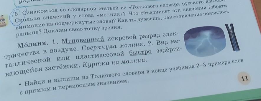 познакомься со своим статьям Из толкового словаря русского языка сколько значений у слова молния что объединение объединяет эти значения Обрати внимание на подчёркнутые слова Как ты думаешь какое значение появилось раньше Докажи свою точку зрения