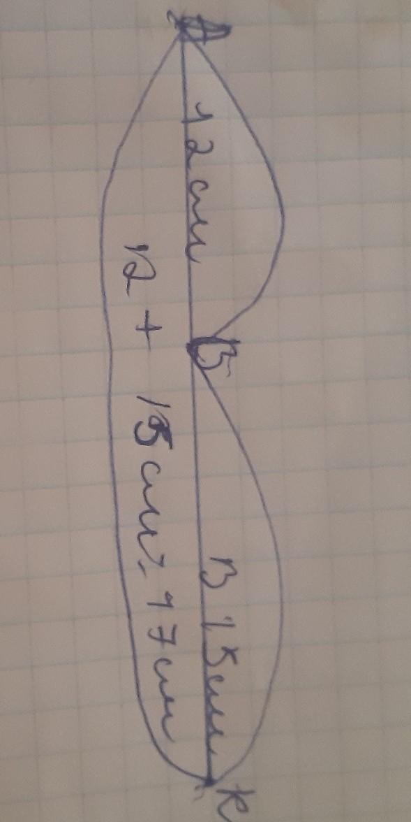 Точки А, В и К расположены на одной прямой, причем AB=12 см, ВК=15 см. Какой может быть длина