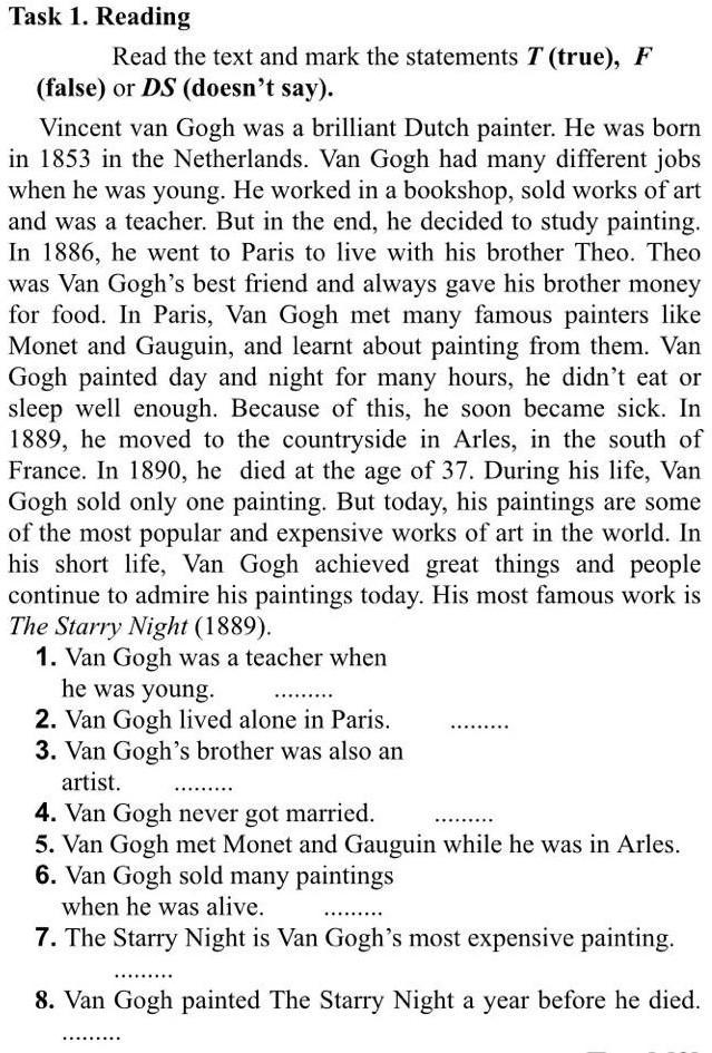 read the text and mark the statements T true , F falce, DS doeusn't say. Van Gogh was a teacher !!! Срочно!!!!