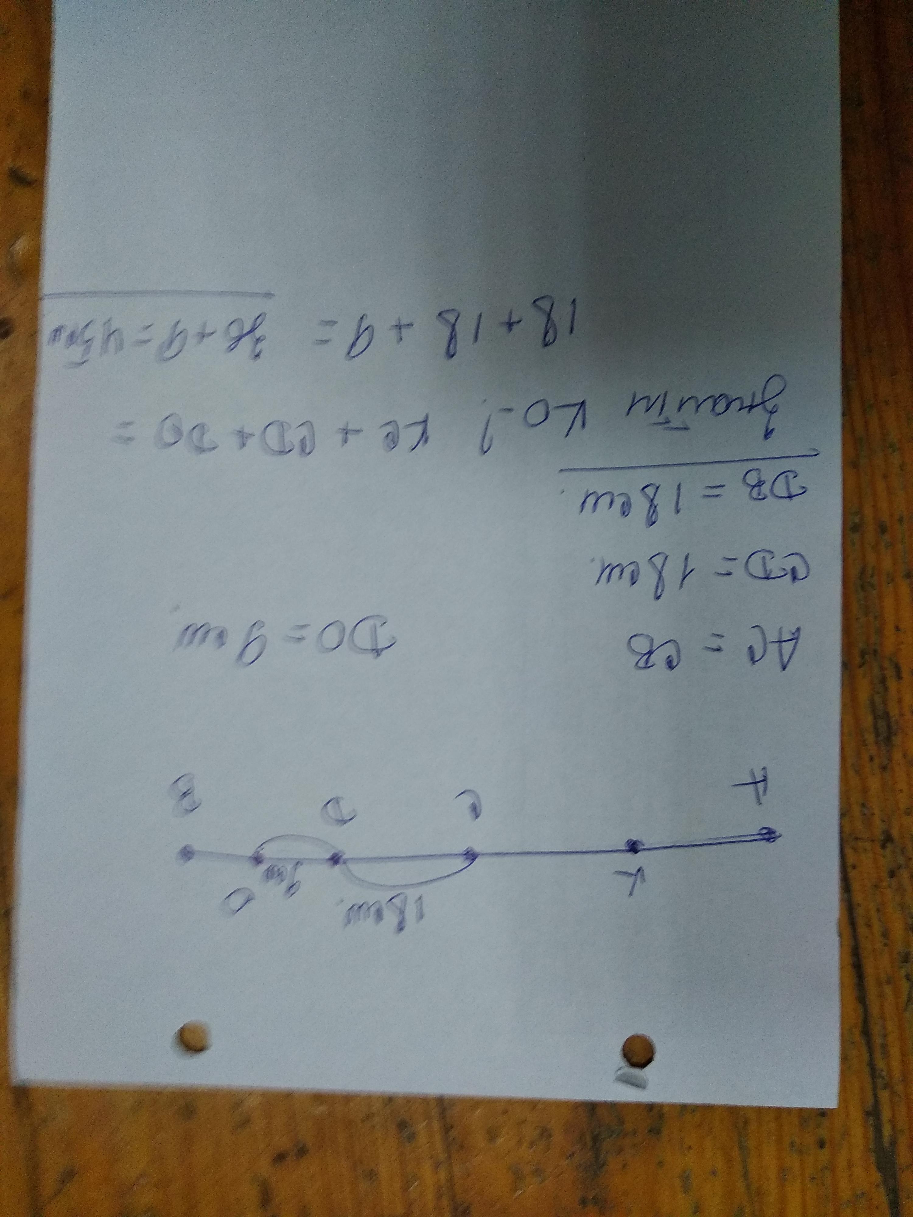 Маємо відрізок АСВ , де АС=СВ На відрізку СВ точка Д ділить відрізок навпіл , і СД=18 см , треба знайти довжину відрізка між серединою АС і ДВ краще дивитися малюнок ..