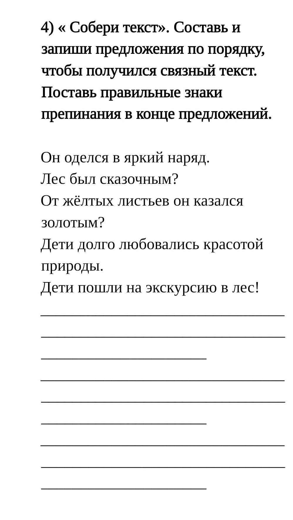 Дети пошли на экскурсию в лес. Лес был сказочным. Он одеося в яркий наряд. От жёлтых листьев он казался золотым. Дети долго любовались красотой природы,