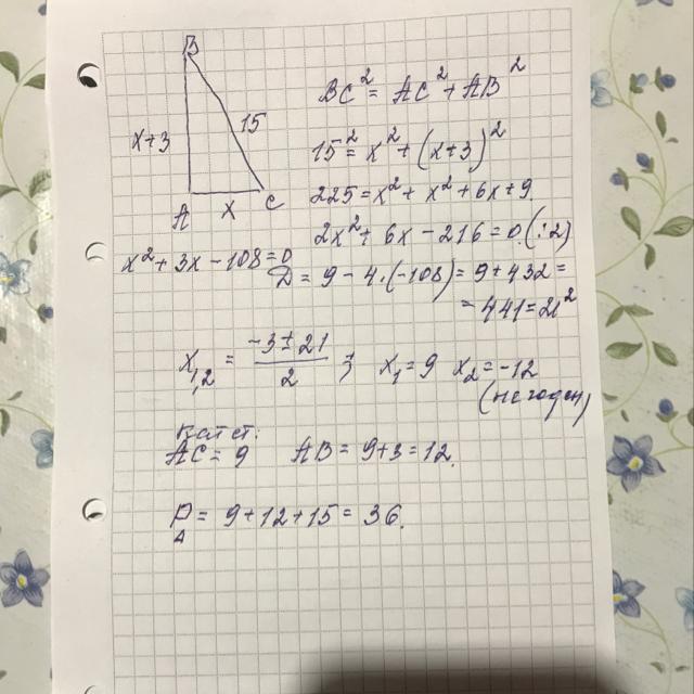 решите задачу, составив систему уравнения. Один из катетов прямоугольного треугольника на 3 см больше другого. Найдите периметр треугольника, если его гипотенуза 15 см.