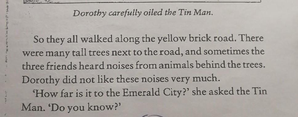 Поэтому все они шли по дороге из жёлтого кирпича. Рядом с дорогой было много высоких деревьев, и иногда трое друзей слышали звуки от животных за деревьями. Дороти не очень нравились эти звуки.