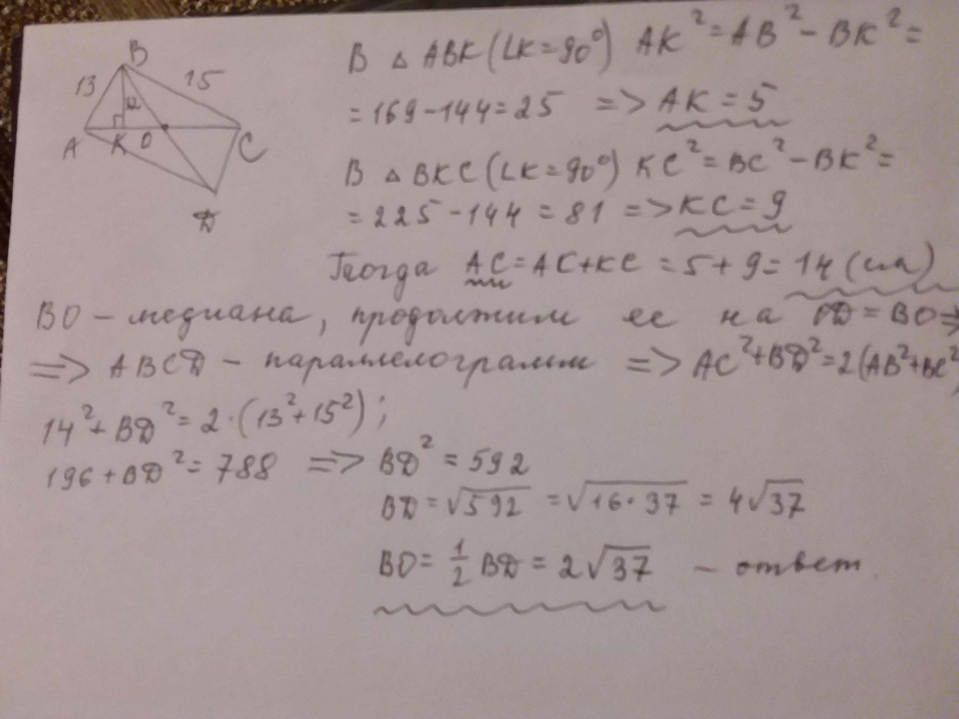 Дві сторони трикутника дорівнюють 13см і 15см, а висота, яка проведена до третьот сторони дорівнює 12см. Обчислити медіану трикутника, яка проведена до третьої сторони. СРОЧНО!!!!