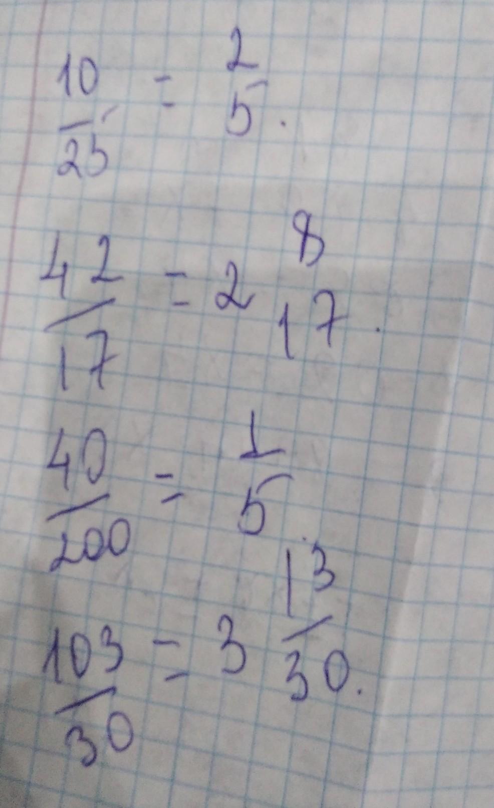 сократимые обыкновенные дроби 10/25 равен 2/5 ,,40/200=1/5