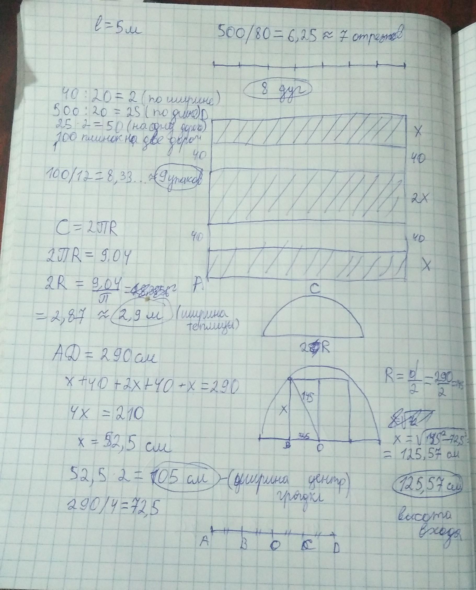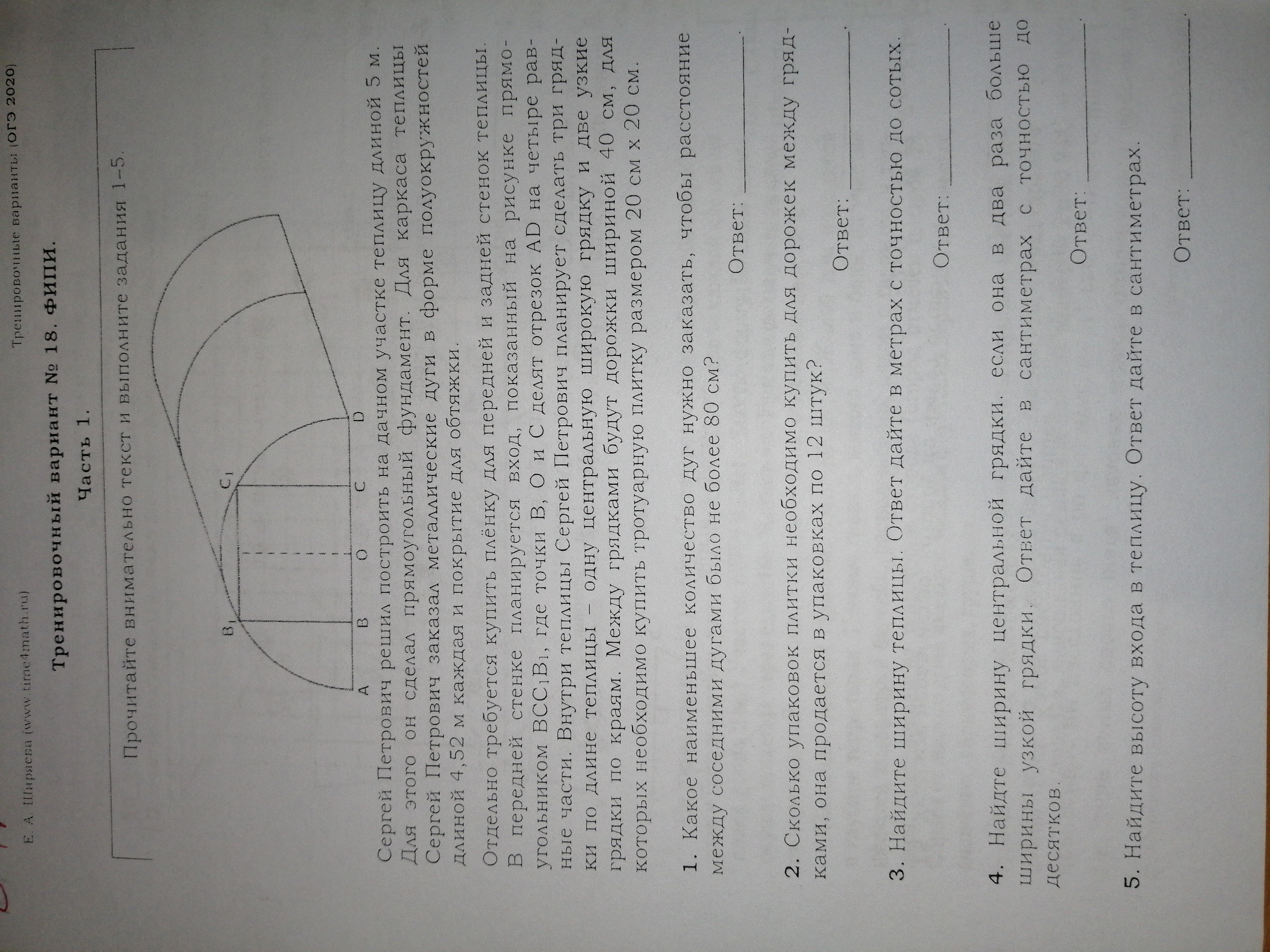 Сергей Петрович решил построить на дачном участке теплицу длиной 5 м. Для этого он сделал прямоугольный фундамент. Для каркаса теплицы Сергей Петрович заказал металлические дуги в форме полуокружнлстей длинной 4,52 м каждая и покрытие для обтяжки.