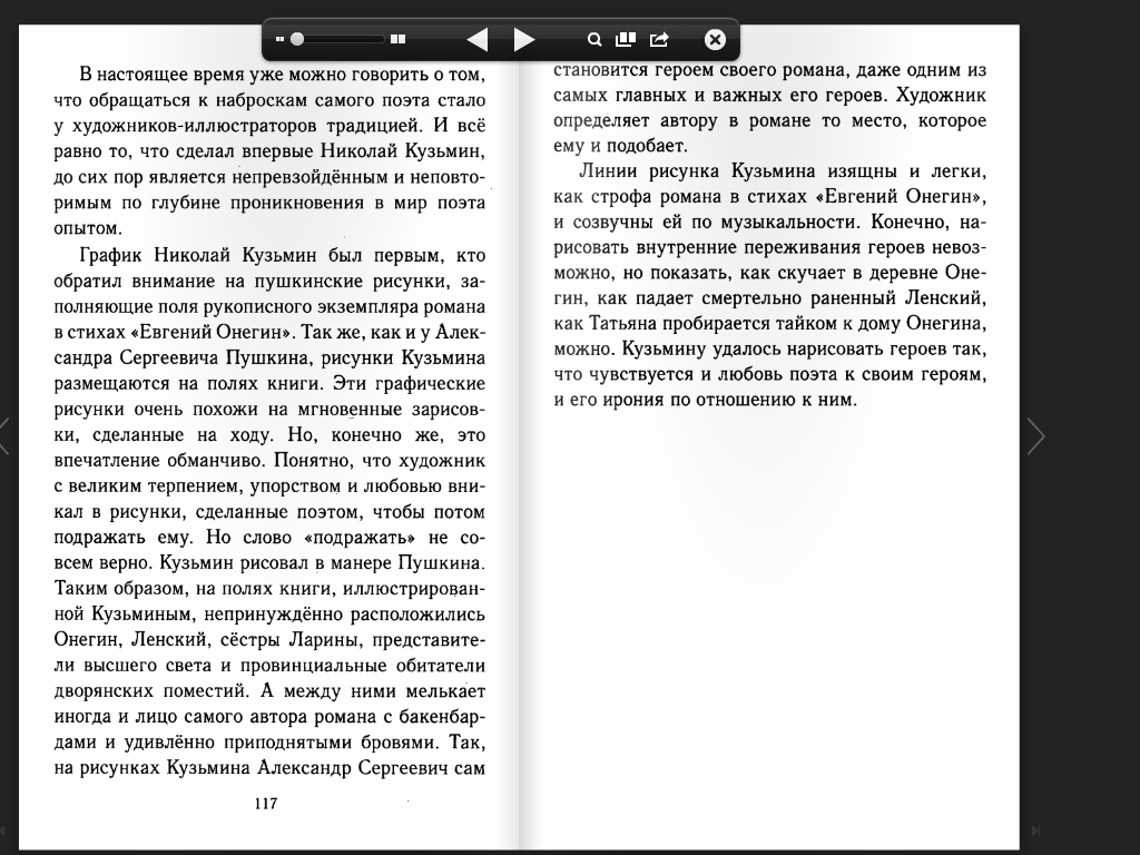 Кузьмин смог принять творческий путь Пушкина и ввел в этот мир читателя. Издание романа с иллюстрациями художника, это не печатное издание, а рукопись Пушкина, не остывшая еще с тех времен.График Николай Кузьмин был первым,кто обратил внимание на пушкинские рисунки. Они заполняли поля рукописного экземпляра романа стихах "Евгений Онегин". Эти рисунки настолько просто,что кажутся мгновенными зарисовками. Но это впечатление обманчиво.Настоящий художник с великим терпением и любовью вникал в свое творчество,чтобы потом подражать ему.Но это не относилось к Кузьмину. Он рисовал в манере Пушкина.