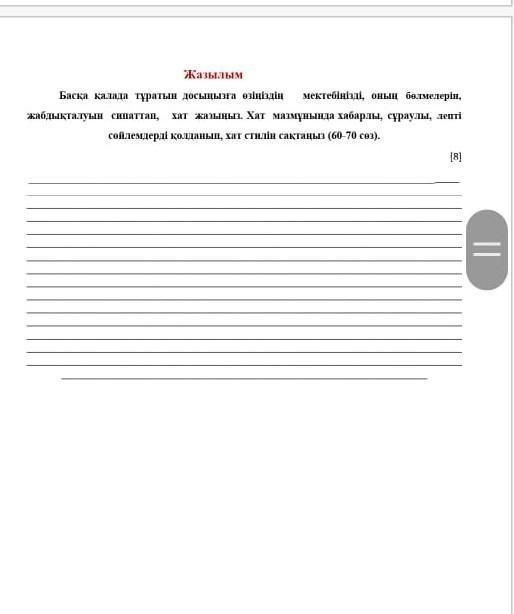Сәлем досым!Қалың қалай?Бәрі жақсы шығар.Менде бәрі де жақсы.Сен кай мектепте оқисың?Мен (өз мектебің)-де оқимын.Мектеп маған ұнайды.Парта,тақта,үстел,тіпті электронды тақта бар.Және оның бәрі жаңа.