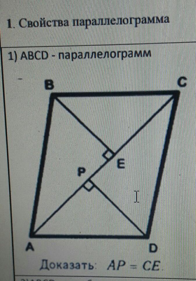 AD=BC (противоположные стороны параллелограмма)=> ∆APD=∆BCE (по гипотенузе и острому углу) =>АР=СЕ