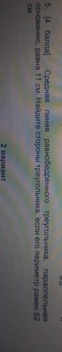 средняя линия равнобедренного треугольника , параллельная к основанию 11см. Найдите стороны треугольника если его периметр равен 52 см